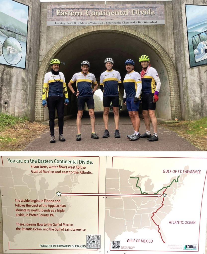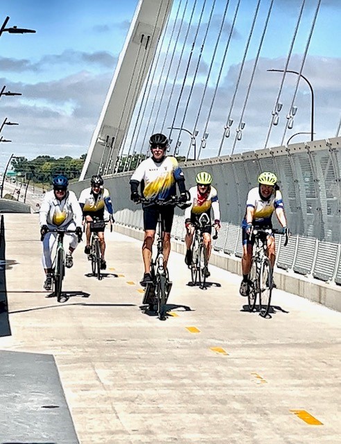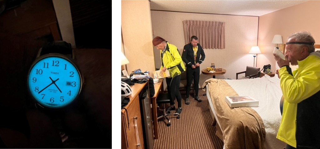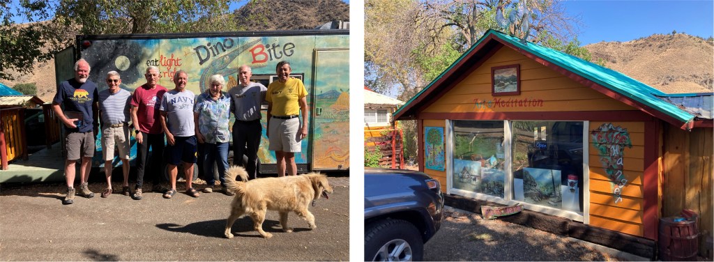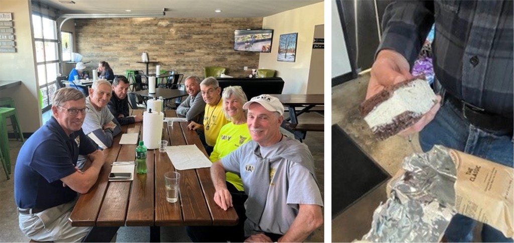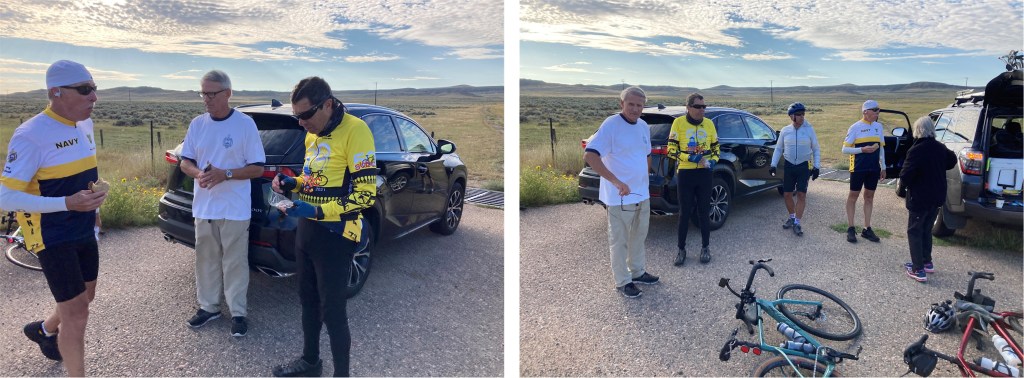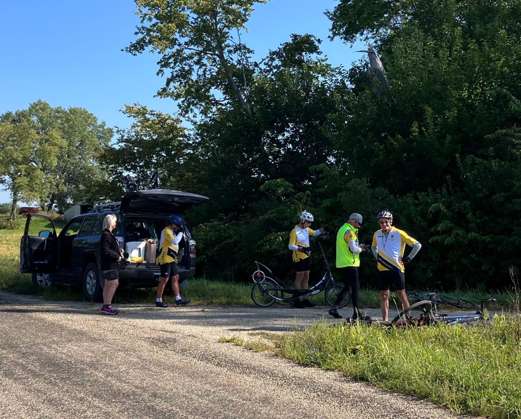 The support crew were absolutely essential. Sally was the den mother/mother hen keeping us in line. She stocked us with bananas and PB&Js before launch, made all the early SAG stops with her “bumper buffet” enroute and negotiated rooms and breakfast arrangements on arrival – then made the daily Facebook posts. Mark made major repairs, serviced the bikes on days off and sent us out every morning with “Make good choices.” He was also the safety officer on the very long and/or hot days, monitoring us for signs of fatigue or dehydration. Nick helped with everything and especially tech issues for us old guys, and Barley was always there whenever you needed a warm paw or a lick.