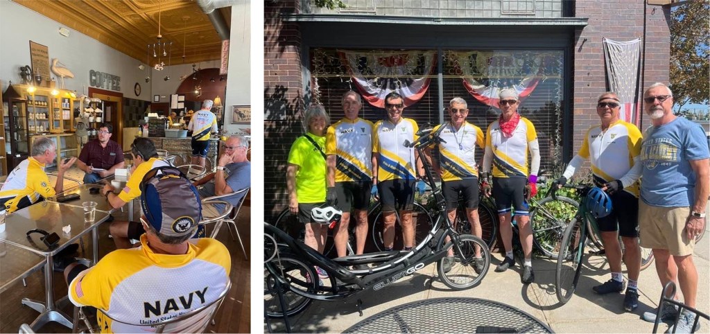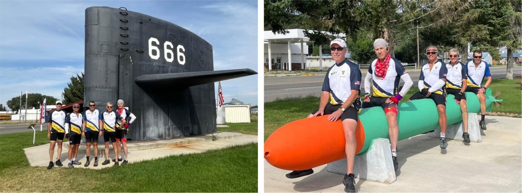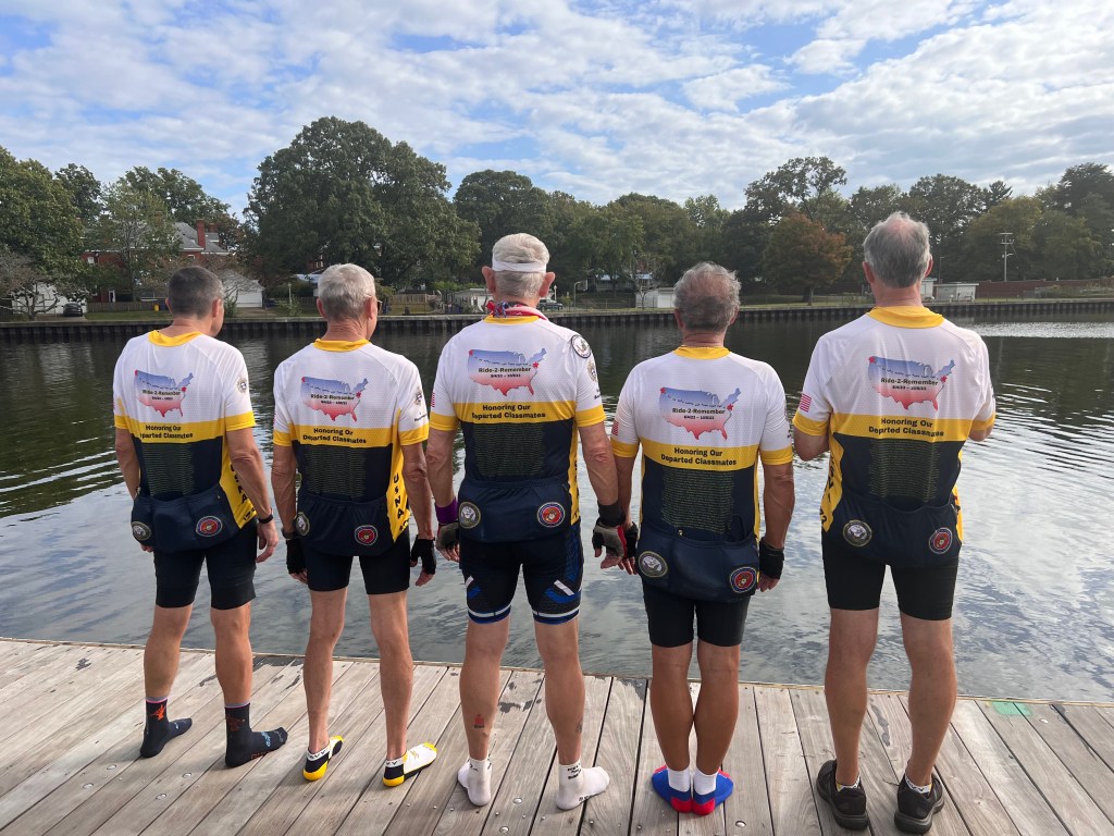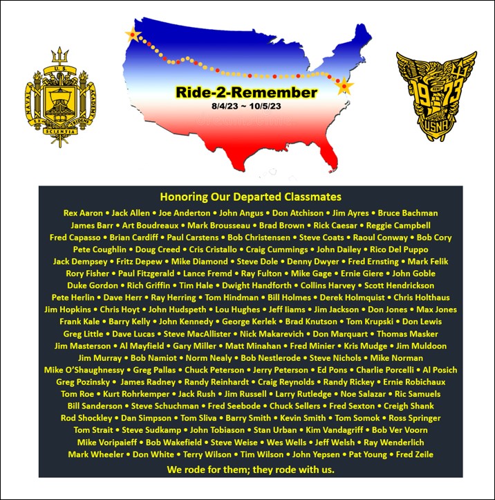 The first level is the mission itself, our rationale for taking on this ride in the first place and the first priority that Doug identified back in Astoria. We set out to honor our departed classmates and symbolically gather their memories back to USNA for our 50th reunion. To that end we specifically rode for and paid tribute to one or more classmates every day. We faithfully executed that duty on a daily basis with personal recollections, obituaries or comments from others where available, and concluded by playing the Navy Hymn. And we raised a glass to toast them whenever we had a beverage on hand.
